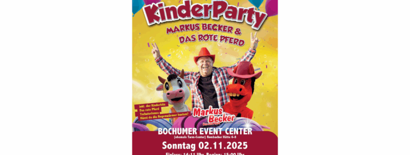 Wer kennt ihn nicht? Markus Becker – der Mann mit dem roten Cowboyhut und dem legendären Hit „Das rote Pferd“ – kommt ins Bochumer Eventcenter! Mit im Gepäck: seine größten Kinder-Partyhits, jede Menge gute Laune und ein Programm, das Kinder, Eltern und Großeltern gleichermaßen begeistert.